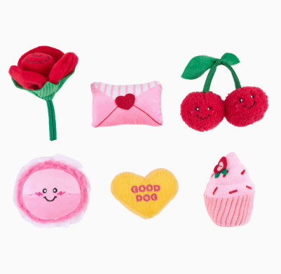 Taille parfaite pour la bouche des petits chiens. Comprend Cupcake, Cerises, Macaron, Cœur en bonbon, Rose et Lettre d’amour Miniz. 1 couineur rond dans chacun.